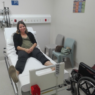 Le lendemain, nous voilà parties aux urgences. Elle est vite prise en charge par un charmant docteur avec en bonus un petit tour en fauteuil roulant.