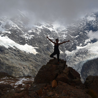 Pour l’instant la vue est dégagée et au fur et à mesure que l’on gravit les marches, on observe les montagnes un peu enneigées et les lacs qui les entourent, oui en Nouvelle Zélande, il y a des lacs partout ! Puis arrive la partie rocailleuse et nous voici comme deux chamois dans la caillasse et le brouillard… On croise les doigts et espère qu’une fois en haut la vue sera dégagée.
